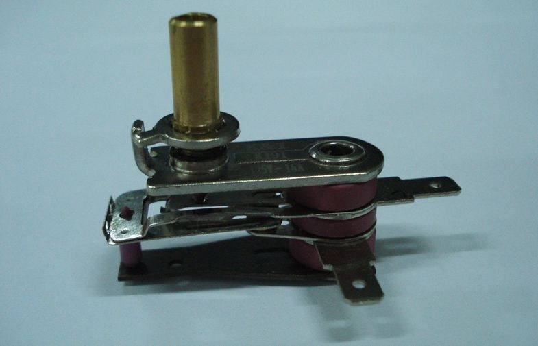 It works on the principle of thermal expansion and contraction, casing the bimetal plate bent, to turn on or off
